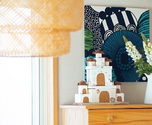 ◆リビングの壁にはマリメッコの大柄ファブリックを。板にマグネットシールを貼って挟んでいます。