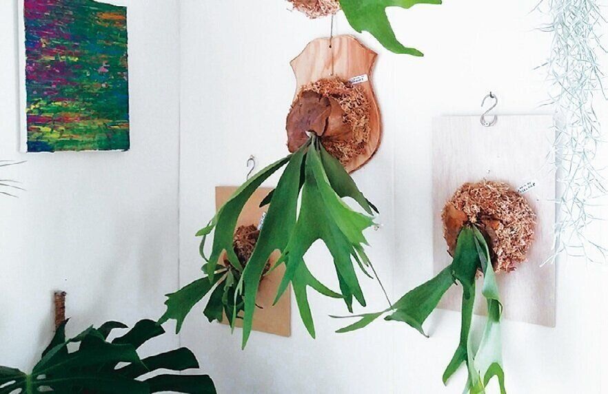 水やりは2週間に1回でOKというコウモリラン。板に貼って壁に飾れば、ワイルドなグリーンアートに!