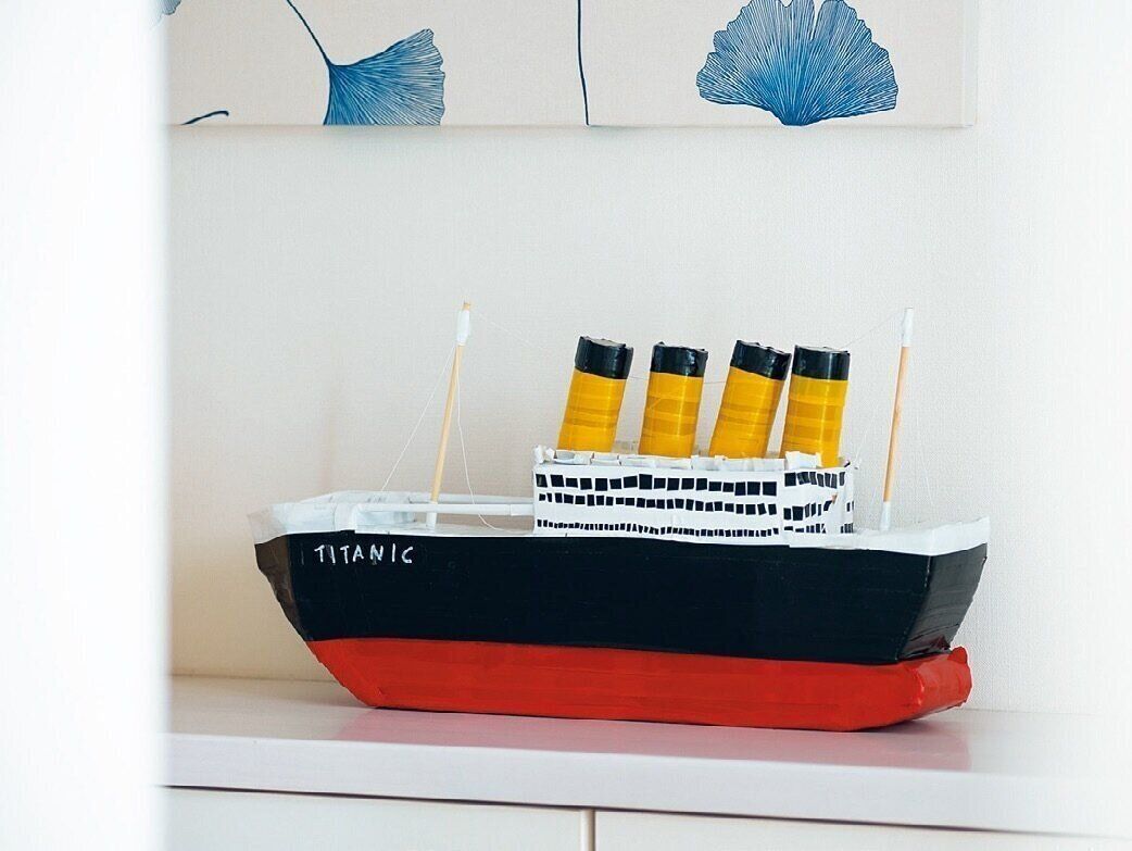 玄関にディスプレーされているのは、長男が制作したというタイタニック号。「北欧では、子どもの作品をアートとして飾っている家が多いんです。子どもが一生懸命作った作品はアート以上の価値があるし、大切に飾ることで自己肯定感が高まると思います」。
