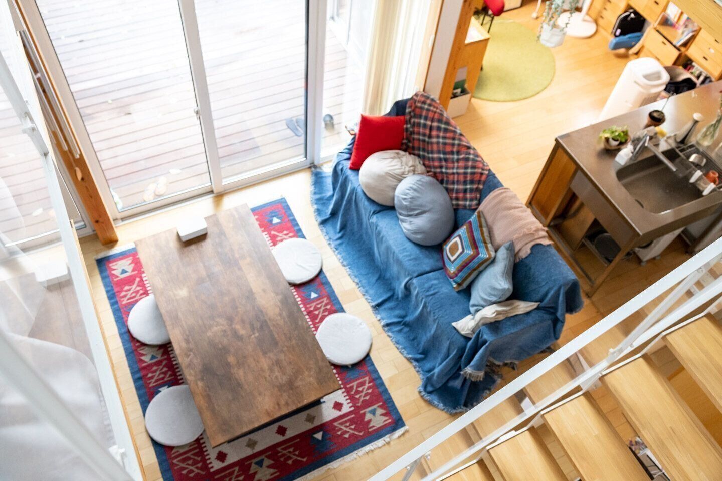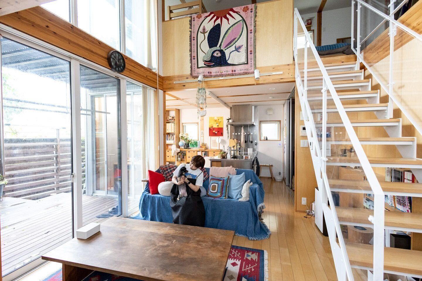 キッチンもリビングも書斎も、家具などでゆるく仕切る感じです。一部屋に籠ったりはできないので、プライバシー感は薄いですが、どこにいても家族の気配を感じる。家族仲はよくなります。よくないとやってられない感じですね(笑)。仕切られていないから、模様替えする自由度も高い。そして大きな窓は日当たりもよくて。