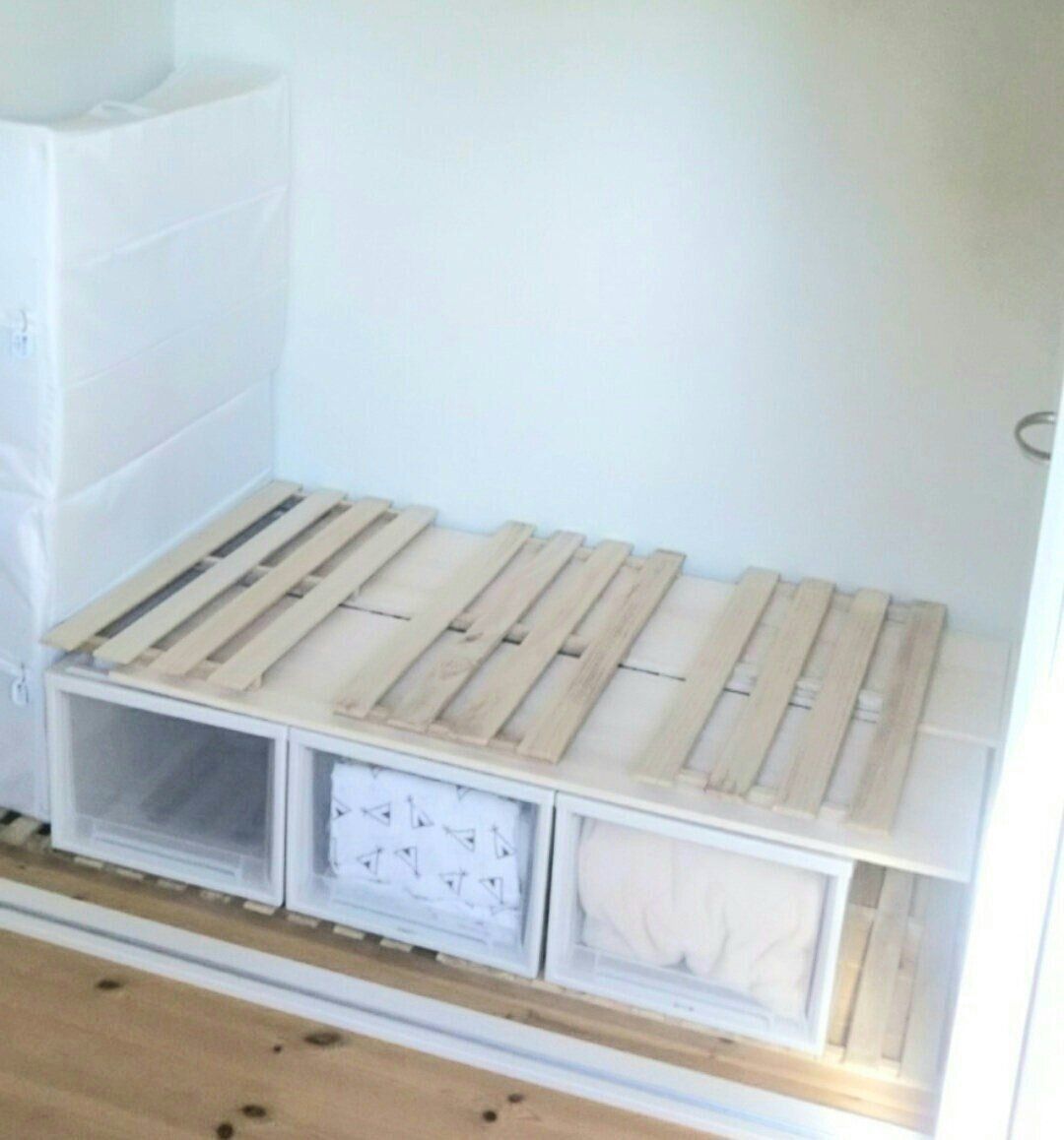 すのこの上に、衣装ケースを3つ並べました。押入れサイズなので、奥行は75cmです。枠がしっかりしている強度のある引き出しケースで、ホームセンターで購入しました。