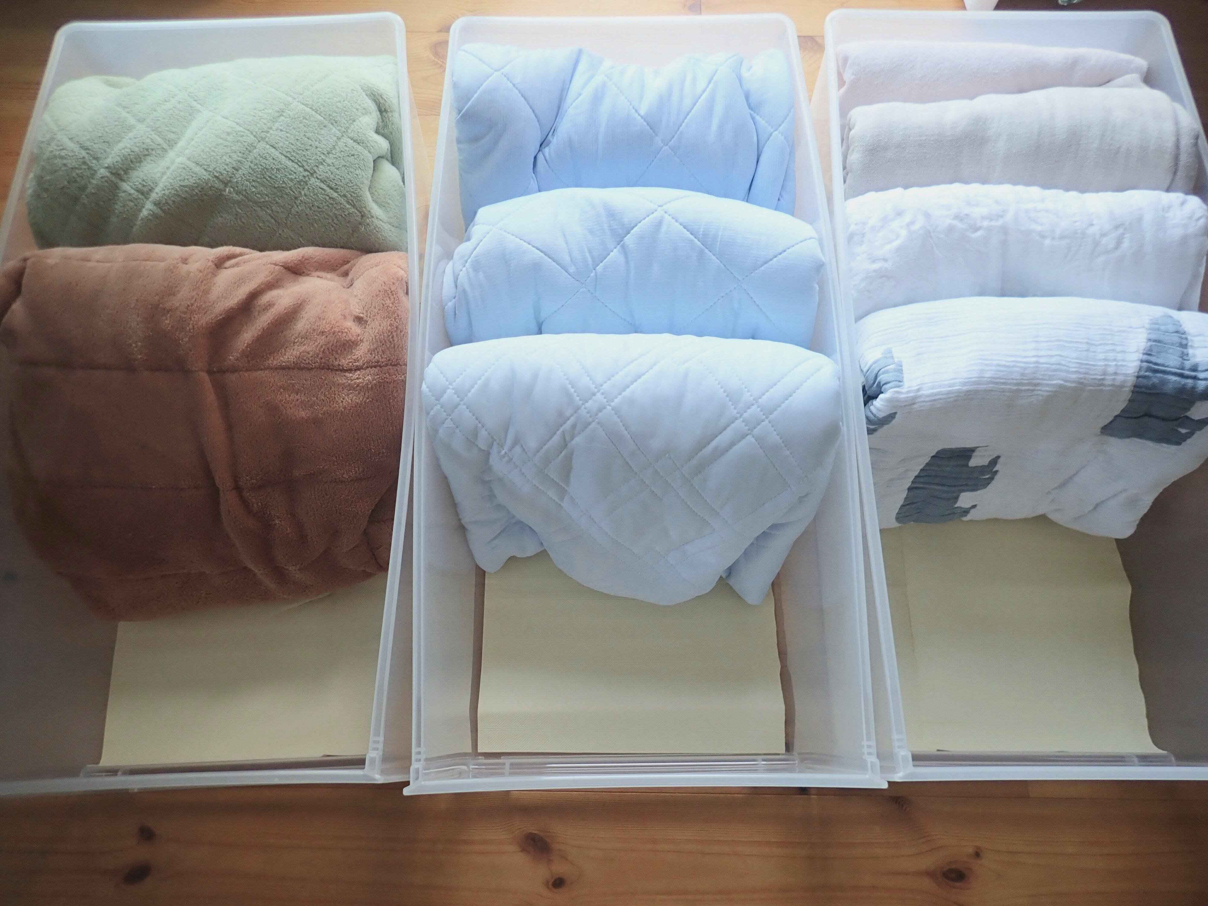 ブランケット、タオルケット、バスタオルも季節外のものはこちらに収納。
