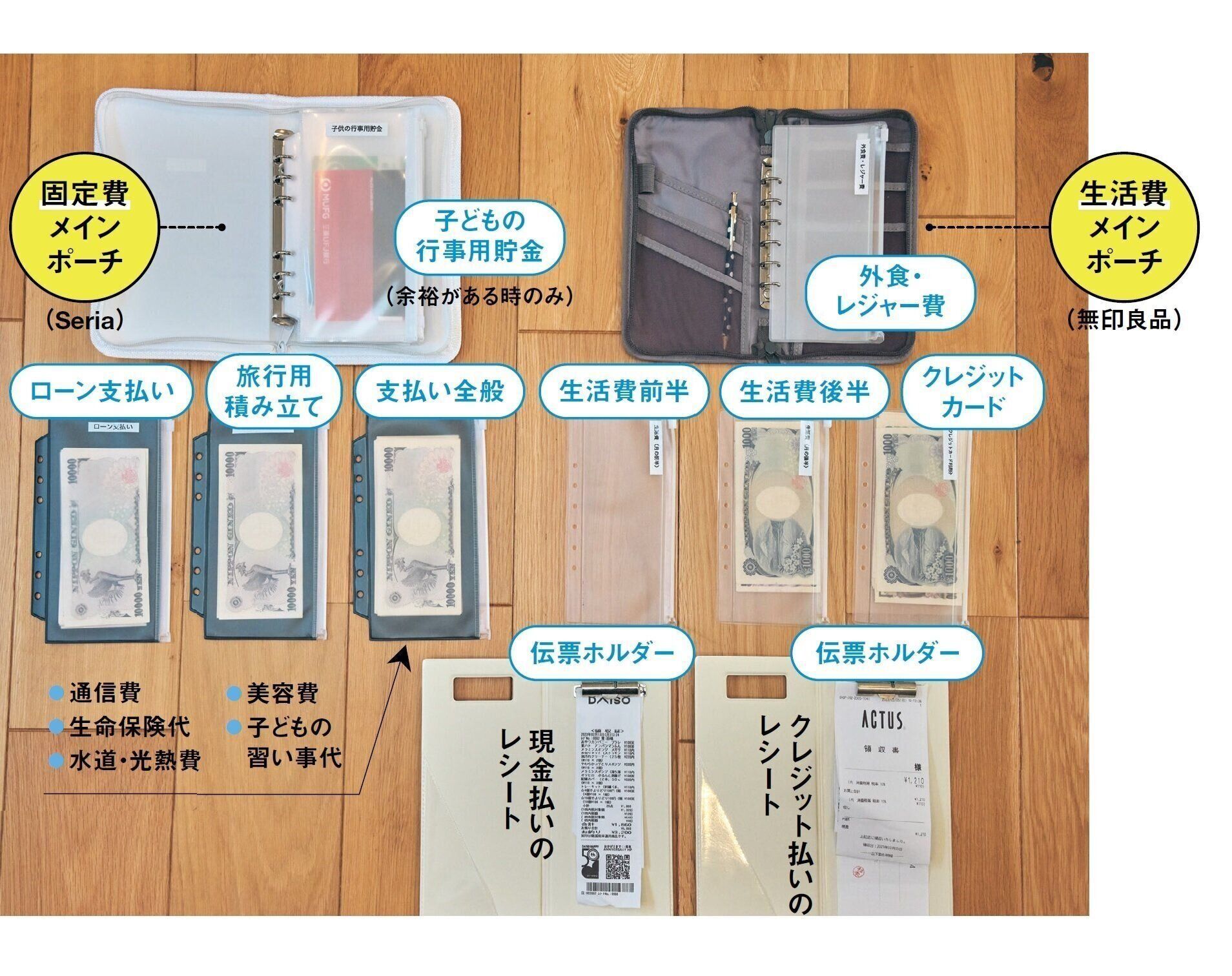 「お金の流れが目に見えないと、いくら使ったか曖昧になるので、現金での袋分けを20年以上続けています。ただ、細かい管理は苦手なので、生活費は前半と後半の2つに分けるだけ」クレジットカードで払ったものは、クレジット払いの袋に現金を移動させる方式に。