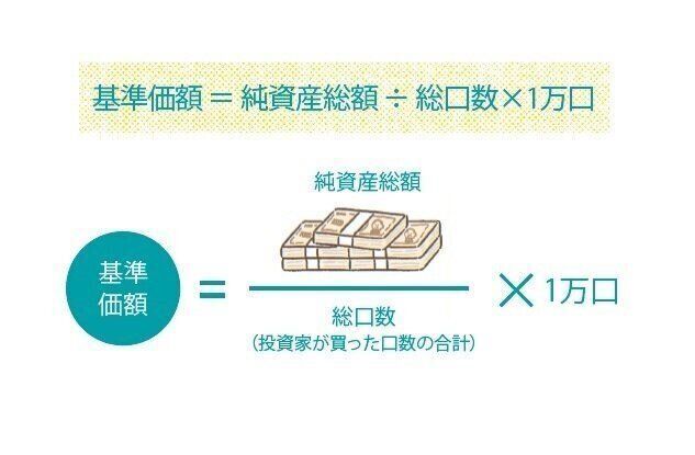投資信託の「純資産総額」を総口数で割って算出し(下記参照)、通常、1万口当たりの値段で表示。株価はリアルタイムで時々刻々と表示されますが、投資信託の基準価額の更新は1日1回だけ。1日の取引終了後に算出され、証券会社や運用会社のHPなどで、その日の夜に更新されます。