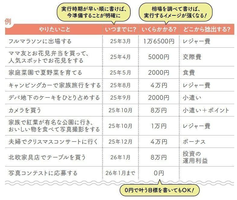 STEP1で書き出した「やりたいこと」も、実行しなければ意味がないので、実行時期(あるいは締め切り)、必要な金額、費用の捻出場所を書き加えます。自分の力で、実際に叶えるイメージが強くなります。