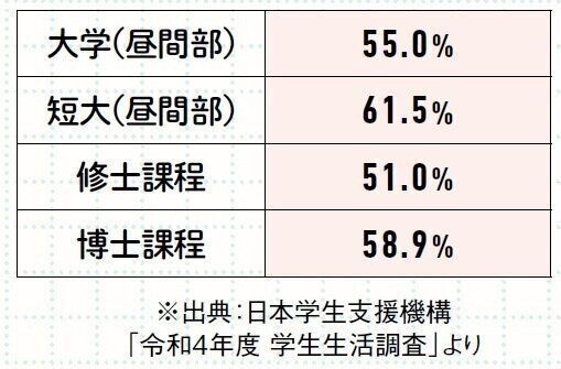 ●今や2人に1人が借りる時代!奨学金を受給している学生の割合