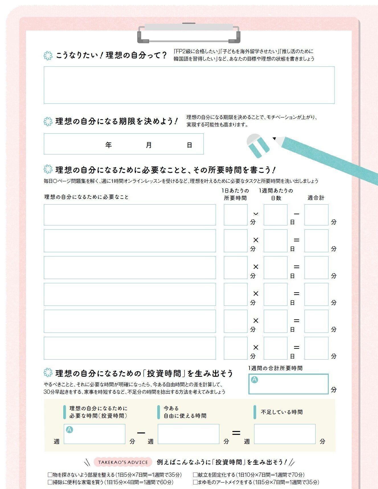 理想の自分になるために必要な時間(投資時間)【A】週[ ]分 - 今ある自由に使える時間 週[ ]分 = 不足している時間 週[ ]分