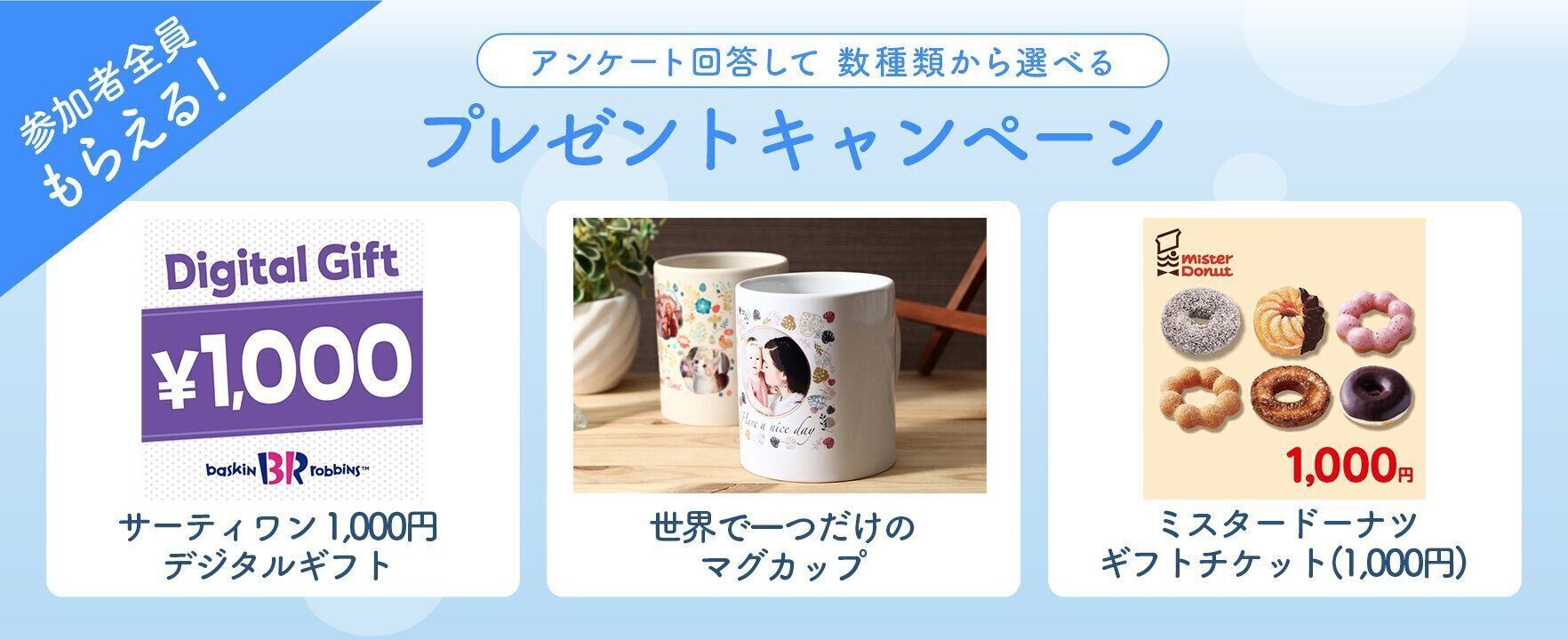 初参加の方は、サーティワン 1,000円 デジタルギフト、ミスタードーナツ ギフトチケット(1,000円)、好きな写真が印刷できる世界で一つだけのマグカップから好きなプレゼントが絶対もらえる!