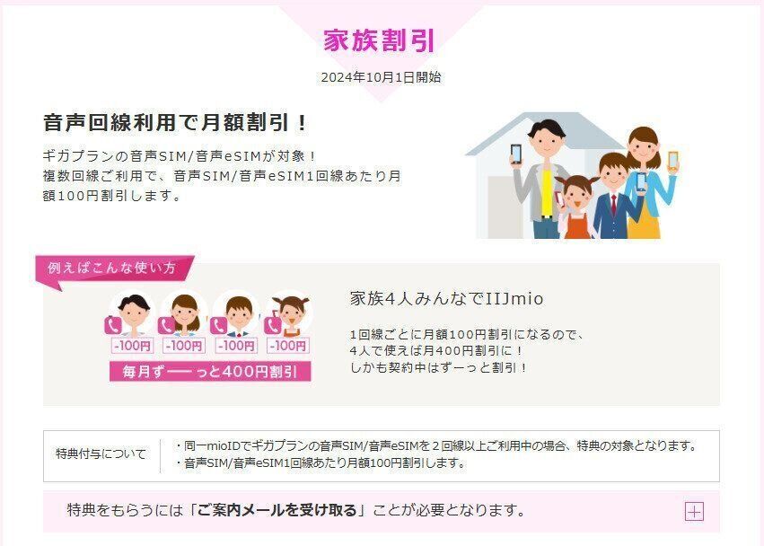 家族割引とは、音声回線を2回線以上ご利用で1回線ごとに毎月100円OFFになる制度で、家族でまとめて契約する方には嬉しいサービスです!