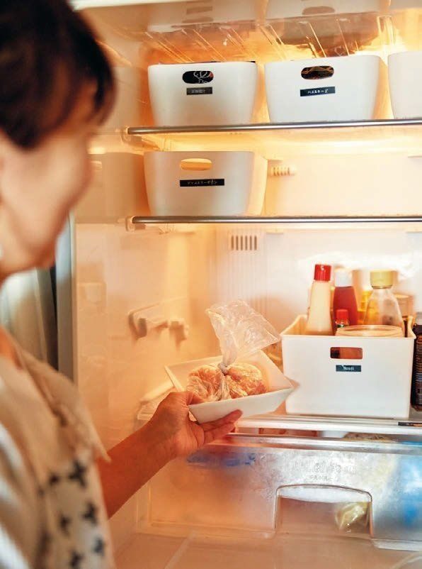 肉や魚は、カット済み、調理済みの冷凍品を1週間分を宅配で注文。多少割高でも冷凍保存がきくので、一度に全部使い切れなくてもムダなし!当日使う予定の肉、魚、使いかけの食材などは、冷蔵庫を開けたときすぐ目につく場所に移動。この収納にすることで、使い忘れがなくなり、食材を最後までムダなく使い切れます。
